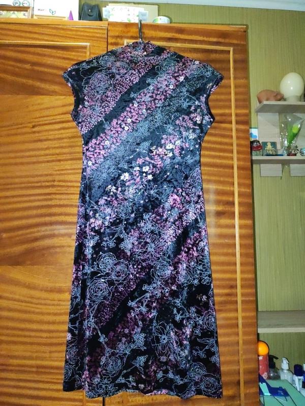 Красиве оксамитове плаття під шийку з вирізом на спинці. На всій сукні приблиск. Офісно переливається на сонці. Довжина 95 см, талія 38 см, у стегнах 44 см, ширина по грудях 44 см і напівобхват шийки 20 см