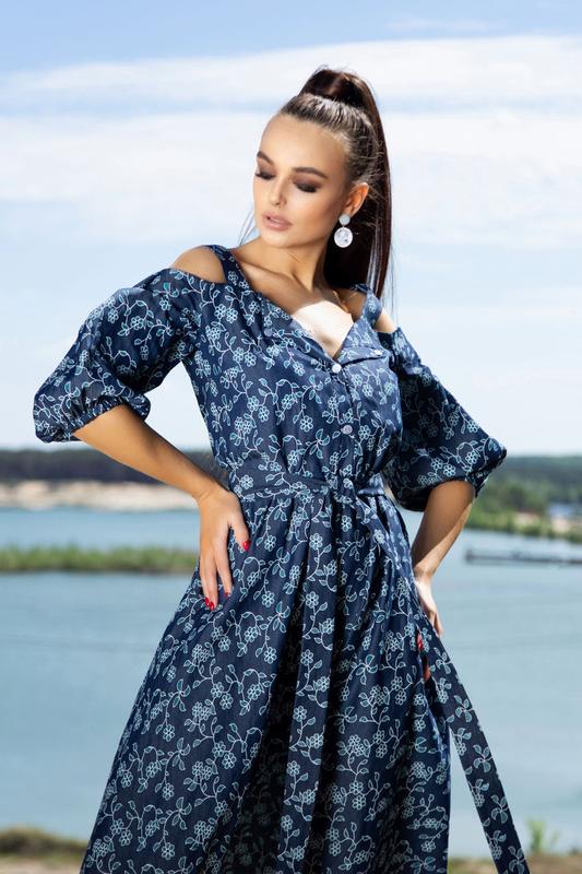 Новая летняя коллекция Free style от интернет-магазина Seventeen предлагает роскошную модель платья для создания романтичного, женственного, повседневного или праздничного образа. Насыщенный темно-синий цвет платья украшен цветочным принтом голубого цвета. Модель отличается необычным кроем с пышной юбкой и открытыми плечами, которые дополнены бретелями. Оригинально также смотрятся пышные рукава с длиною три четверти, за счет открытых плеч они слегка приспущены. Молодежное платье пошито из высококачественного принтованного коттона, в котором летом не жарко. Отложной воротник и планка дополняются маленькими пуговицами. Выгодно подчеркнуть линию талии помогает съемный пояс.