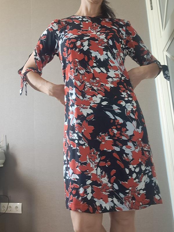 Гарна сукня вільного крою, з осіннім принтом( листя) .Розмір укр. 46-48. На бірці-М На підкладці, ,приємна до тіла. Рукав 3/4, з зав'язками Довжина-96см Пог-48 см