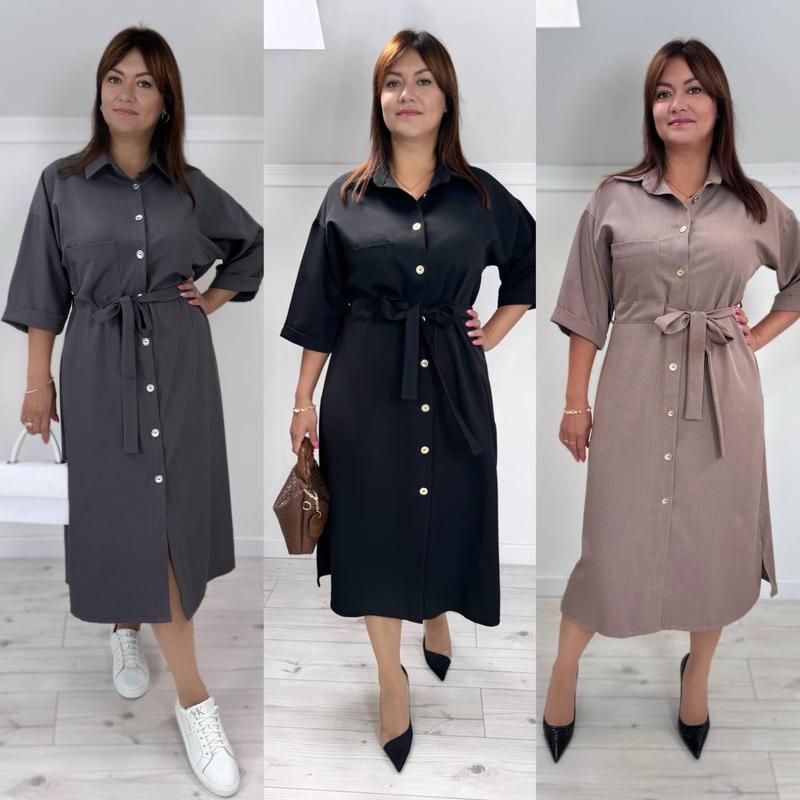 Сукня арт. ha2. 2778 Тканина: тіар костюмний Колір: чорний, графіт, мокко Розмір: 48-50, 52-54, 56-58 Сукня з шикарної тканини високої якості, на ґудзиках. Комір стійка. На грудях кишеня-куліска, з поясом.