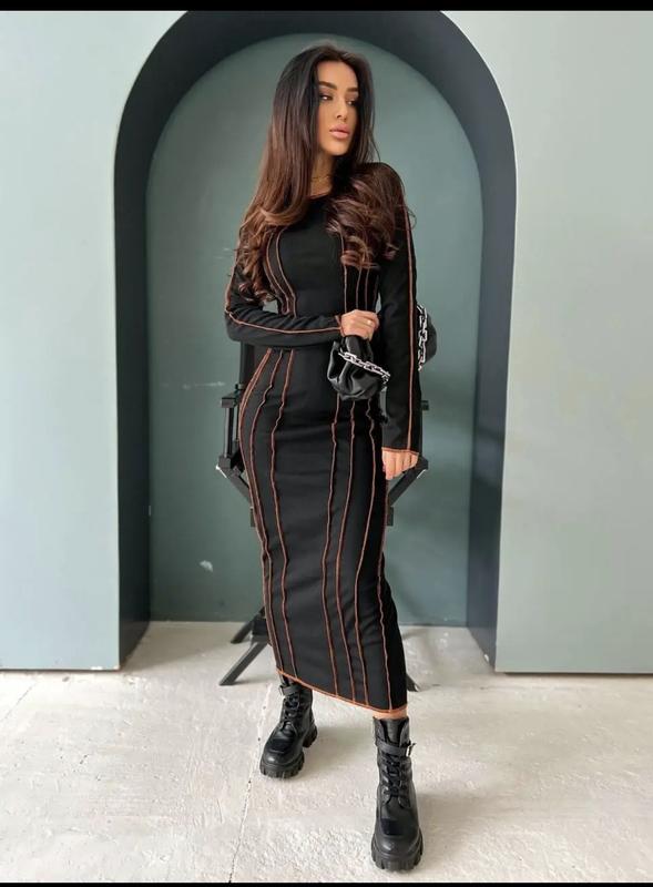 женское стильное платье. Тканина рубчик, тягнеться добре. Яркие швы, длина миди. Ткань плотная, хорошо ложится и подчеркивает фигуру.