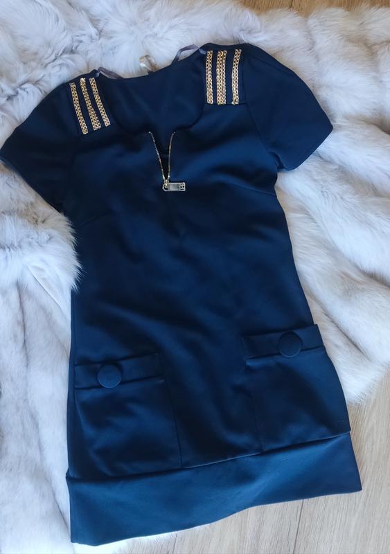 Сукня підійде на дівчат з розміром XS, S. Виконане з цупкої тканини, не кошлатиться. Декороване золотими ланцюжками. Є дві нашиті кишені спереду. Є незамітий дефект, який легко виправити - показано на фото, треба прикріпити ланцюжок.
