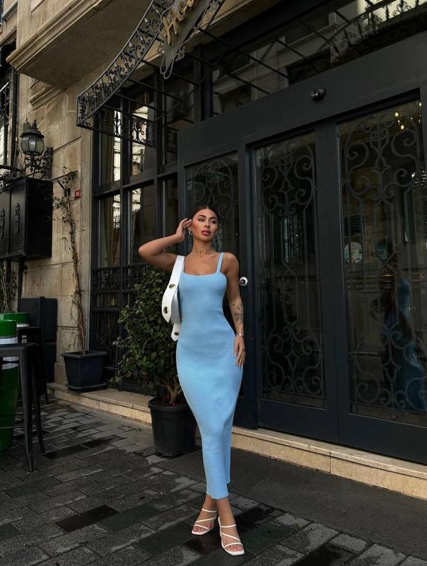 Сукня жіноча, міді, блакитна, приталена, рубчик, на шлейках