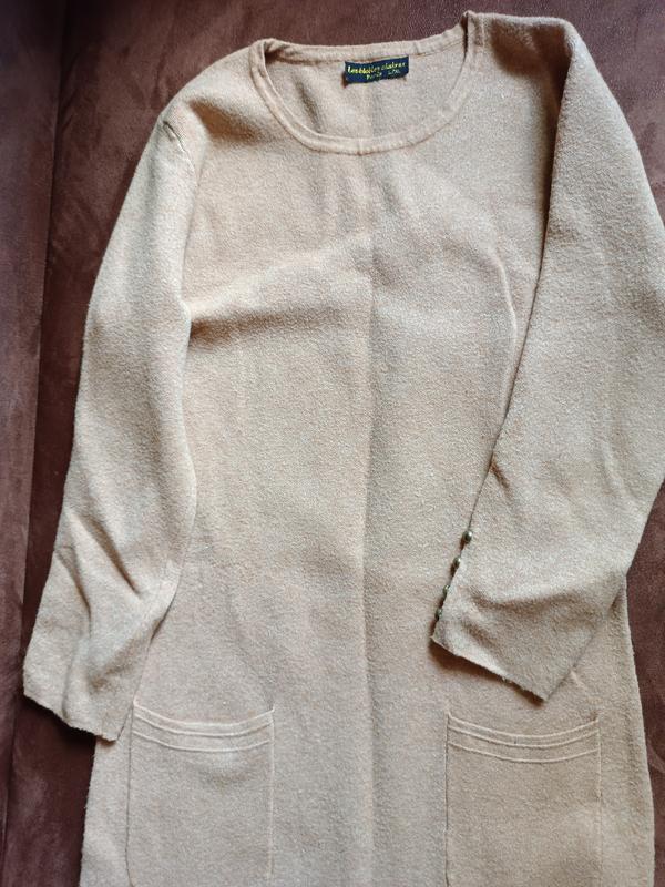 Шерстяное платье футляр. Цвет бежевый. Спереди есть два карпана, на рукавах пуговицы. Длина до колена. Очень теплое, ткань тянется. В области пояса слегка закатывается. Длина 95 см Ширина в груди 43 см Рукав 46 см. Подойдет на размер С, М. Может и Л следует мерить.