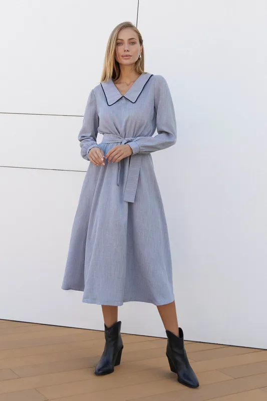 Сукня виконана з костюмної тканини зі спідницею фасону напівсонце. Напівприталений крій з розрізною талією на резинці, доповнена декоративним коміром. В комплект входить пояс. Рукава мають манжети. Також є дві бокові кишені. Розміри: 42-44, 46-48, 50-52 Тканина: італійська костюмка (70% бавовна, 20% віскоза, 10% поліестер) Кольори: бежево-пудровий, сірий, блакитний Довжина виробу: 114 см Довжина рукава: 61-63 см Не робіть замовлення на сайті — пишіть у віконці під оголошенням! Відправка відбувається протягом 1-4 днів. Оплата повна або накладний платіж з мінімальною передплатою.