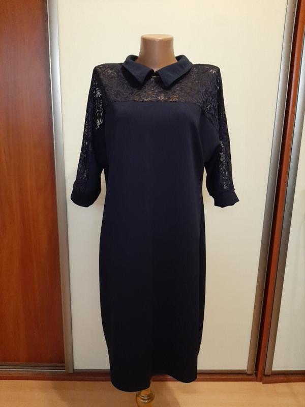 Красива витончена сукня темно-синього кольору. гарно сідає по фігурі. Рукав 3/4. Тканина креп дайвінг з гіпюровими вставками. Розмір 50-52. Параметри сукні: об'єм грудей 104 см, талії 100 см, в бедрах 114 см, по низу 114 см., довжина 96 см.