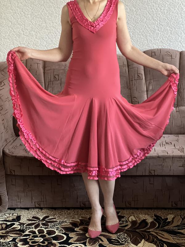 Сукня міді без рукавів коралового кольору розширена до низу фалдами, декорована атласною стрічкою. Матеріал мікродайвінг, дуже приємна до тіла, не потребує прасування. Розмір S Заміри по запиту