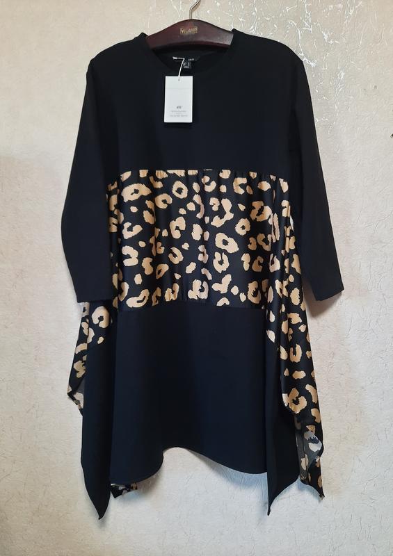Сукня H&M. Розмір UK -16 EUR - 44. Чорного кольору 100% бавовна. Сукня трапеція оригінального крою з леопардовою вставкою тканини 97% поліестер і 3% еластан. До низу розширене з розрізами по боках. Ширина плечей 50см. Довжина рукава 56см. Ширина під рукавами 56см. Довжина сукні 95см.