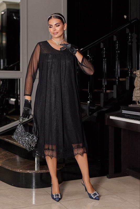 Сукня- " з мереживом по низу " # 972 (Ал-Коз) Ціна 1250 грн. Розміри: 48-50, 52-54, 56-58 Розміри йдуть спарені. Тканина: Нижня тканина- глітер три.ж з блисткітками ( тягнеться) Верхня тканина- сітка три.ж. По низу мереживо. Фактичні заміри: За 52-54 розміром. Нижня тканина: Довжина від пройми - 86 см. ОГ- 110 см ОТ- 114 см. ОБ- 124 см. Верхня сітка : Довжина від плеча- 104/110 см. Рукава- 54 см. ОГ- 140 ++ см. ОТ- 160 см. ОБ- 160 см. ПО ЗАМІРАХ дивимося по нижній тканині.. До кожного наступного розміру додавати + 4см ( на поодинокі розміри). На спарені + 8см, крім довжини виробу. Зріст моделі на фото 170см. На моделі одягнений 52-54 розмір. Параметри моделі на момент зйомки: БРЮНЕТКА: ОГ: 96 см. ОТ: 88 см ОБ: 116 см. Додаткові характеристики: Дуже гарна, комфортна та стильна сукня. Нижня частина: Вільного покрою трапеція з блискучої тканини ( гарно сяє ) Верхня сукня з сітки: Вільного покрою, по низу декоровано мереживом. І нижня і верхня тканина добре тягнеться. Кольори нижньої тканини: Світле срібло. Темне срібло ( гематит) Чорне. Сітка йде чорна.