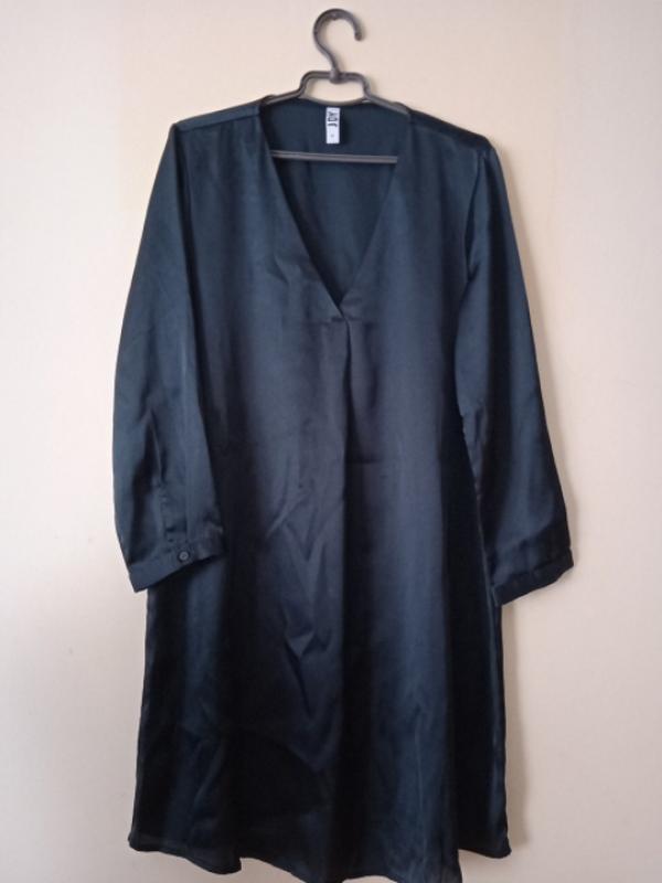 Длина 88 см. Плечи 40 см. Полуобъем в груди 58 см. Рукава 51 см. Бедра 60 см. Бирка отсутствует. Ткань в виде атласа переливается. Цвет зумрудный. Есть пояс.