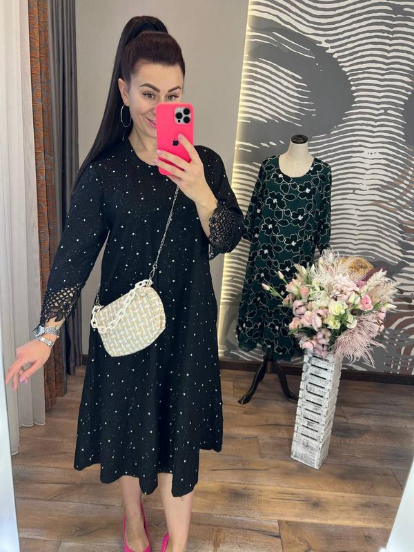справжній шедевр високої моди, казково красива сукня виконана з м'якого і приємного до тіла трикотажу з багатим декором, в ній ви будете сяяти на корпоративах, сімейних урочистостях і дружніх вечірках сукня вільного крою з круглим вирізом, кишенями з боків і ефектними рукавами, прикрашеними мереживом і пришитими стразами, ідеально пасує дівчатам з різними типами фігур, вона подарує вам гарний настрій і займе гідне місце у вашому гардеробі розміри 50, 52, 54, 56, 58 довжина 100-102 см, об'єм грудей залежно від розміру 110-128 см по виробу, довжина рукава від шиї 63-65 см код L 10086B-15