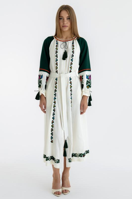 Неперевершена лляна сукня вишиванка жіноча міді довжини має автентичний орнамент за мотивами стародавньої вишивки кінця ХІХ – поч. ХХ ст. Модель привертає увагу незвичним кольором основи – вершковим, та оригінальною різноколірною рослинною вишивкою на рукавах, подолі та вздовж передньої частини. На увагу заслуговує довгий рукав-реглан, який складається з двох частин зеленого і вершкового кольору. Плаття заслуговує на увагу з багатьох причин, у тому числі й тому, що вишивка внесена до переліку нематеріальної культурної спадщини України. Вишукана сукня вишиванка жіноча з рослинним орнаментом Представлена модель вирізняється з поміж інших унікальною технікою вишивки, що є однією з найдавніших на території України. Квіткові гірлянди на подолі, передній планці та квіти на рукавах виконано в техніці лічильна гладь, що різниться об’ємним, густим малюнком. Купити сукню вишиванку варто за її характерні особливості, відмінні риси: пошита з натуральної лляної тканини, що чудово пропускає повітря, вбирає зайву вологу, не парить навіть за високих температур; модель має вільний силует, її об’єм регулюється поясом, а застібається вона на дерев’яні ґудзики, що сховані за планкою; оригінальний крій рукава, що складається з двох частин, верхньої – зеленої, нижньої – вершкової, декорованої вишивкою; колориту виробу додають декоративні китиці, які знаходяться на рукавах, поясі й на горловині, регулюючи її об’єм; за правильного догляду плаття буде служити роками, не втрачаючи при цьому яскравості кольорів, форми. Ошатна сукня вигідно доповнить святковий образ, буде актуальною для багатьох урочистостей, проте й у будній день модель є доречною. Якщо ж вас цікавлять парні вишиванки, то доповнить сімейний лук чоловіча вишиванка, дитяче плаття, сорочка для хлопчика з тієї ж серії.