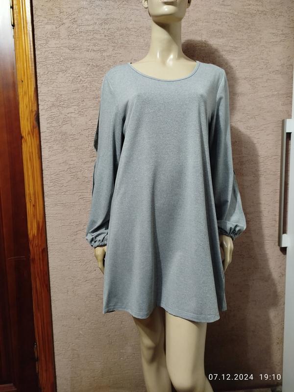 Стильне плаття з довгим рукавом сірого кольору в чудовому стані. Довжина виробу по спинці від плеча 90 см, напівобхват грудей 53 см, довжина рукава 60 см. Тканина 65% бавовна 35% поліестер, тягнеться. Модель 5503
