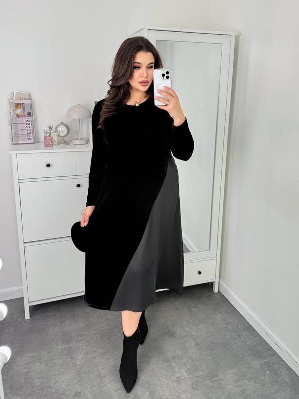 ⬆️Плаття Арт 2159 ❤️111б Тканина бархат, двосторонній щільний шовк (не плутати з дешевим шовком «Армані») Колір чорний Розмір 48-50,52-54,56-58 Неймовірно гарна сукня з приємного до тіла бархату та двостороннього шовку. Чудово сховає будь-які недоліки фігури. Довгий рукав. Тканина добре тягнеться.