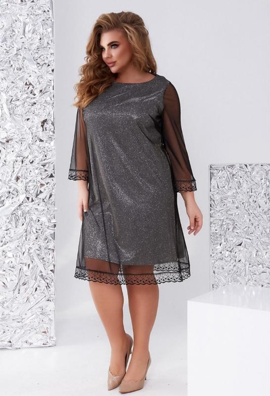Модель: 5732 Розмір: 46-48,50-52,54-56,58-60 Тканина: диско галограма + сітка флок + дороге мереживо Колір: сірий срібло Вимірювання 46-48 ОГ 108, ОС — 116 довжина рукава 52, довжина сукні ниж.92 верх 99 50-52 ОГ 116, ОС — 124 довжина рукава 52, довжина сукні нижньої 93, верх 103 54-56 ОГ 120, ОС — 128, довжина рукава 55, довжина сукні нижньої 98, верх 109 58-60 ОГ 124, ОС — 132, довжина рукава 55, довжина сукні нижньої 100, верх 109