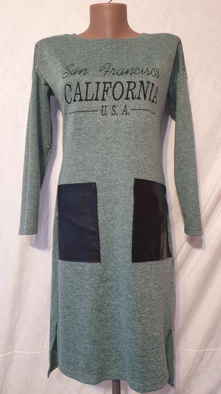 Лаконічна сукня на кожен день. Прямого силуету, з розрізами по боках для зручності. Стан ідеальний- одягалась кілька раз.матеріал тягнеться. Сукня приємного зеленого кольору. В ідеальному стані, без кошлатання. Усе відповідає фото. Зручна. Підійде на розмір М , С Перед на 5 см коротший за спинку. По боках йдуть розпірки. Пог =43 Пот =39 Поб =45 Довжина по переду =95 Довжина рукава від горла ( бо рукав плечовий шов зпущений)= 63.5