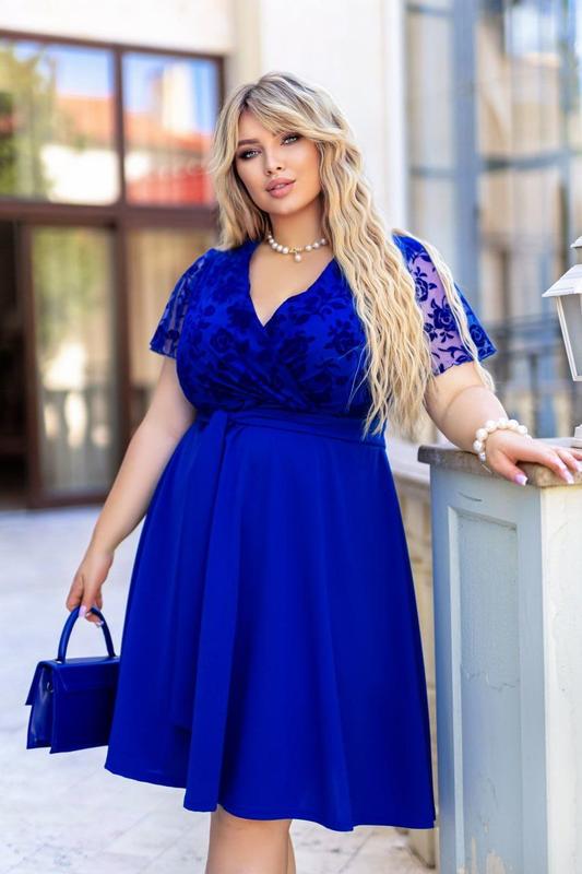 Сукня №6699. Розмір: 50-52, 54-56, 58-60. Колір: електрик, зелений, бордо, синій . Тканина про-во Туреччини: креп дайвінг, сітка флок . Сукня прикрасить будь-яку фігуру і зробить Ваш образ чарівним та романтичним! Ідеально підійде для урочистостей, так і для повсякденного носіння, і обов'язково стане вишуканою прикрасою Вашого гардеробу. Перед сукні з імітацією запаху. До сукні додається знімний пояс із основної тканини. У такій сукні будь-яка жінка зможе відчути себе справжньої леді та королевою вечора, ця сукня здатна надати жінці ніжності, легкості та елегантності. Виміри: РОЗМІР 50-52: Сукня: дв. 105 см, рукав 28 см ОГ-105 см, ОТ-112. РОЗМІР 54-56: Сукня : дв. вир. 106 см, рукав 29 см. ОГ-118 см. ОТ-120 РОЗМІР 58-60: Сукня : дв. вир. 107 см, рукав 30 см. ОГ-124 см. ОТ-126 см.