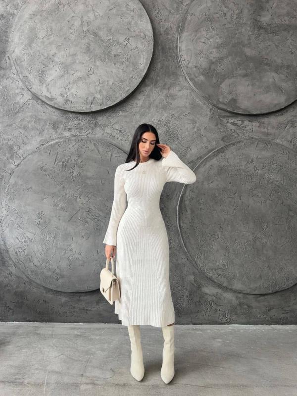 Платье миди приталенного кроя из мягкого, приятного к телу трикотажа. Модель с длинными рукавами и юбкой клеш. Платье станет базой для создания минималистичных комфортных образов. • Размер универсальный • Длина 125 см • ОГ 80-100 см • ОТ 60-80 см • ОБ 80-110 см • Состав: 50% Коттон, 50% акрил