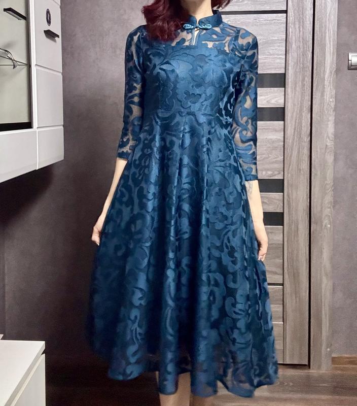 Красивлюща святкова сукня міді насиченого петрольного кольору. З якісного кружева, на підкладці. З стильним воротніком. Стан як новий. Мій зріст 179см