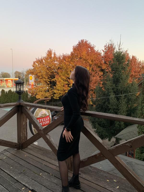 приталенное платье, длины миди, трикотажная, имеет вырез и чокер с камушками на шее. Одягнена на розімір С