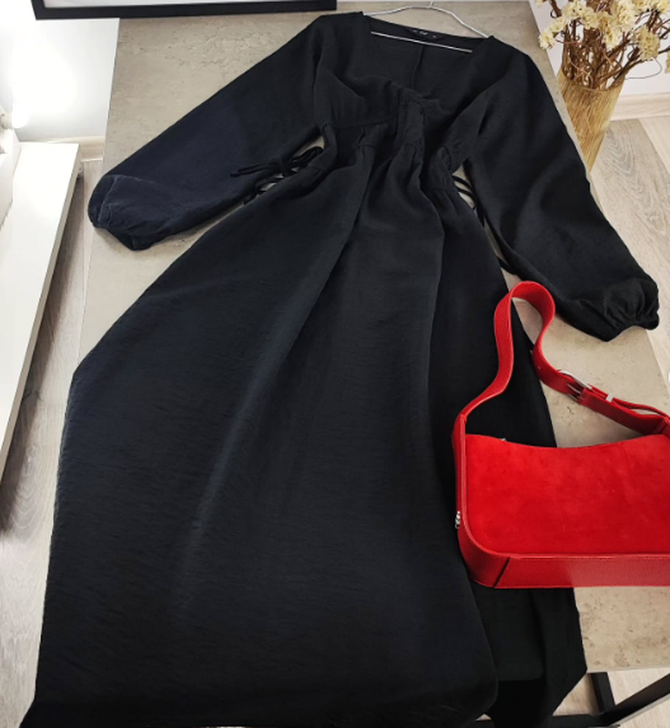 80% віскоза, 20% поліамід, легка цупка тканина, не тягнеться Розмір UK10/38 (M) Довжина 129 см Півобхват грудей 52 см Півобхват талії 47 см, на резинці Півобхват бедер 58 см Довжина рукава 62 см Ширина плечей 38 см Стан нової речі