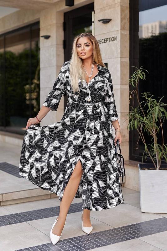 Сукня №578/1 (1)Розміри: 50-52, 54-56 (2)Розміри: 58-60, 62-64 Тканина: силки (подібна софту/шовку) Довжина-130 см Сукня на запах з V-подібним вирізом, на грудях кишені-клапани. Рукав 3/4