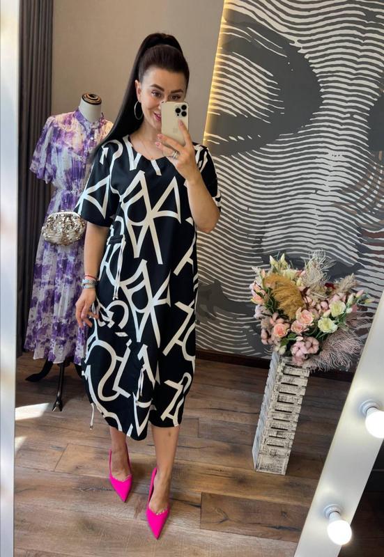 легка й оригінальна сукня прямого крою, трохи розширена на стегнах, з круглим вирізом на грудях і короткими рукавами, з першої хвилини потрапляє до наших сердець і гардеробів, асиметрична сукня зі шнурками у вигляді декору має стильний і сучасний вигляд, нерівний крій подолу створює цікавий силует, а шнурки додають елемент грайливості та оригінальності, таке вбрання відмінно підійде для вечірніх заходів або неформальних зустрічей, привертаючи увагу своєю унікальністю сукня виготовлена з приємного до тіла котону з еластаном з яскравим і виразним принтом розміри: у чорному кольорі 50, 52, 54, 56, 58 у світлому кольорі 50, 52, 56, 58 довжина 122 см, об'єм грудей по виробу від 116 см до 132 см, довжина рукава від шиї 35-37 см, об'єм стегон по виробу від 128 см до 142 см код L 230824 D
