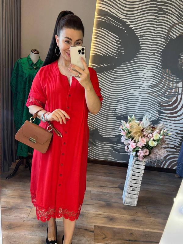 неймовірно красива та елегантна сукня приталеного крою з витонченим вирізом на грудях, ґудзиках спереду, короткими рукавами, зручними кишенями по бокових швах та оригінальними защипами спереду, які чудово підкреслять красу вашої фігури сукня виконана з якісного і приємного до тіла дихаючого котону з еластаном червоного кольору, прикрашеного по подолу і рукавах ефектним мереживом розміри :50, 52, 56, 58 довжина 118-120 см, об'єм грудей по виробу від 112 см до 128 см, довжина рукава від шиї 40-42 см, об'єм стегон по виробу від 138 см до 160 см код L 230948