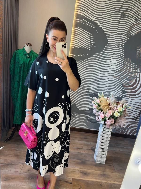 яскрава, комфортна й універсальна сукня вільного крою з круглим вирізом, короткими рукавами та зручними кишенями по бічних швах, ідеально підходять для роботи, прогулянок, зустрічей із друзями та інших повсякденних заходів, вона виготовлена з дихаючого котону з еластаном високої якості, приємного до тіла, оздоблена чарівним принтом розміри: 52, 54, 56 довжина 118-120 см, об'єм грудей по виробу від 116 см до 124 см, довжина рукава від шиї 37-38 см, об'єм стегон по виробу від 120 см до 132 см код L 9212