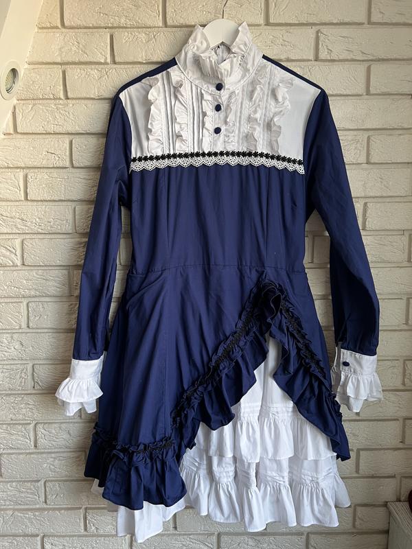 Сукня бавовняна, розмір Л, стан ідеальний. Насиченого синього кольору. По заду є шлейки для затяжки стрічки. Заміри Плечі 42 Під рукавами 53 Ширина талії 47 Довжина 96