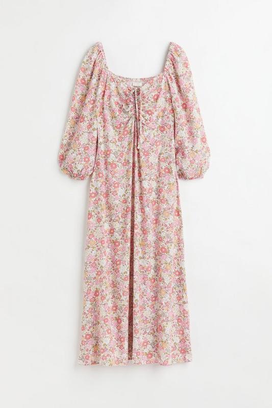 Розмір L(довжина 120 см,пог до 53 см,поб до 54 см,полу талія 40 см.) Сукня довжиною до литок із якісної крепованої віскози. Сукня має виріз горловини у формі серця із шнурком у верхній частині спереду. Закутана частина ззаду. Рукави-буфи довжиною три чверті з вузькою гумкою на плечі та на манжетах. Відрізна по талії і злегка розкльошена спідниця. Без підкладки.