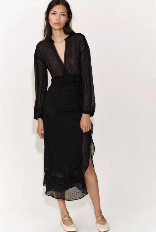 Сукня середньої довжини з круглим коміром, довгими рукавами, резинкою на поясі та підкладкою. Волани. Виріз із зав'язками на комірі та розріз спереду внизу. ЧОРНИЙ | 2207/809/800