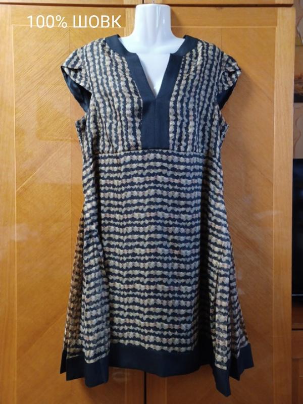 Красивое и изысканное платье от известного английского бренда JAEGER. Верх - 100% шелк.Основой материал легкий и полупрозрачный шифон. В середине подкладка 100% вискоза. Сзади сверху вырез и застежки пуговицы на шее. Спереди вырез. В середине есть разрезы по бокам, снизу. Сверху - снизу по бокам вставки - фото 8. Стан идеален, но есть нюансы в середине на подкладке - это указано на 5 фото, возможно еще есть что-то ( не заметили), это учтение в цене и продается без претензий и возврата. Застегивается на молнию по боковому шву. На бирочке размер 14. Замеры делали с верха. Полуобхват груди позади 50 см, груди спереди 56 см, по талии 46 см, по бедрам 50 см. Ширина в плечах позаду 44 см . Рукав длина от плеча 7 см. Пройма рукава полуобхват 25 см. Высота по спине от плеча у горловины 94 см, по спине по середине от выреза 70 см, от подмышек 70 см (из них до талии 13 см) ), по переду от плеча у горловины 95 см ( из них до талии 38 см), по переду по середине от выреза 70 см. Камера не совсем верна передает цвета, ближе всего 7 фото. ❗️НАЛОЖЕННОГО ПЛАТЕЖА- ПРЕДОПЛАТЫ, БЕСПЕЧНОЙ ОПЛАТЫ, ПОВЕРННОСТЬ И ОБМЕНА НЕМЕТ. ❗️Отправляем после полной платы на карточку Приватбанка. ❗️Доставка Новой или Укр ( +5 грн по упаковке) по почте за средства покупателя. Можно оформить доставку здесь, с указанием, НА КАРТОКЕ ПРОДАВЦЮ, ❗️Карточку просить только в том случае, когда уверены, что покупаете товар. *10 924*