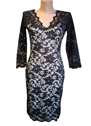 Плаття в гарному стані з чорного мережива і бежевої підкладки, не світиться, класичного стилю, еластичне. Довжина 91 см, плечі 38 см рукав 50 см в грудях 42 см напівобхват талії 34 см напівобхват бедра 42 см напівобхват.