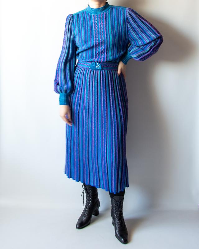 Неймовірна трикотажна вінтажна сукня 🦋 - 85% вовна, 9% мохер, 5% нейлон, 1% шовк - Красива фактурна тканина - Є пасок - Пишні рукава - Високий комір - Made in Italy - Розмір M-L - Плечі 39, Пог 50, пот 33/41, рукав 64, довжина 126 - В ідеальному стані