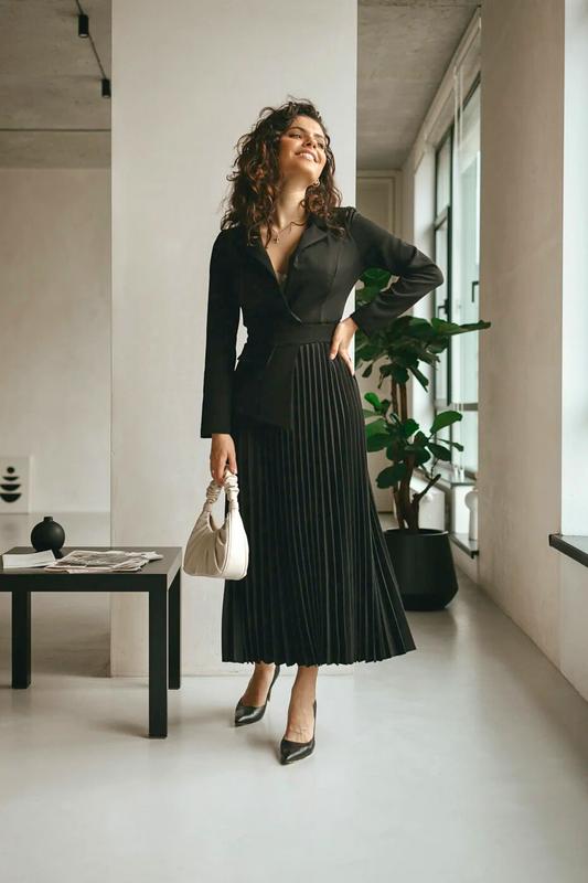 Чорна міді сукня зі зйомною баскою та пишною плісе спідницею