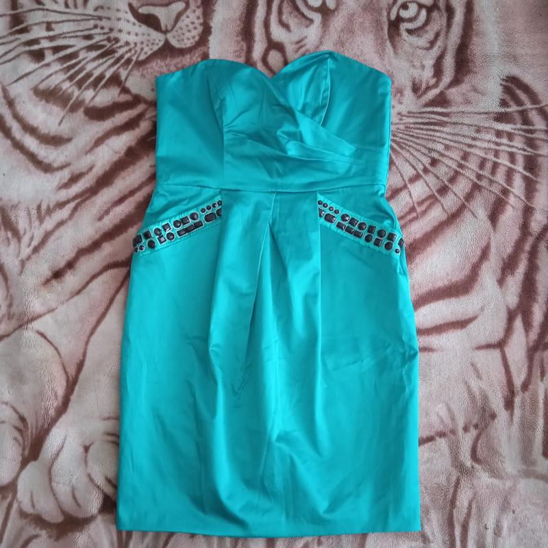 Вишукана сукня смарагдового кольору.Гарно лягає по фігурі,має спереду складочки які приховають животик якщо він є.Ззаду є невеликий розріз для зручності ходьби.Є приховані кишені декоровані чорним камінням(якщо камінці не подобаються,то їх можна віпороти ).З середини є петельки( можна прищібнути прозорі силіконові лямки від бюстгальтера за потреби).На фото колір плаття не такий насичено зелений як в реальності Довжина по боковому шві 70 см,