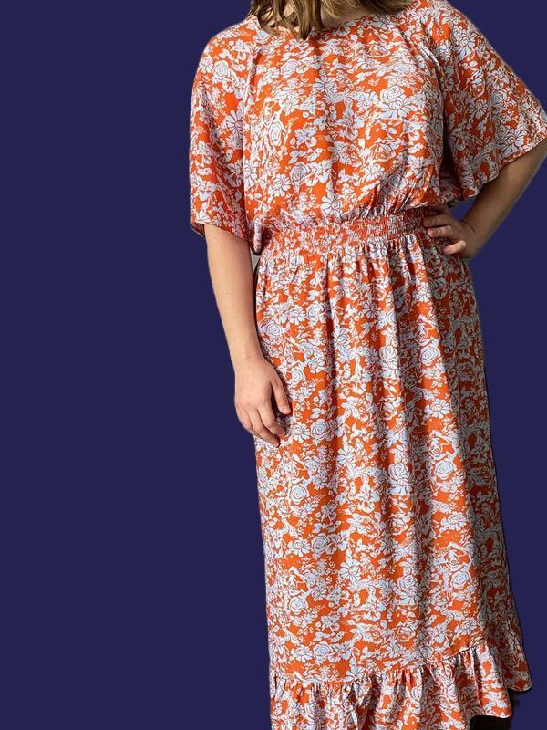 Сукня , віскоза .неймовірно жіночна.Помаранчеві квіти на блакитному фоні. З рукавами крильцями НОГ-64-65 НОТ-40-60 СТЕГНА ВІЛЬНО Пройма-28 довж.рукава-38 до талії-35 від талії-88 Довжина від рукава-132від спинки ( вона заокруглена-127
