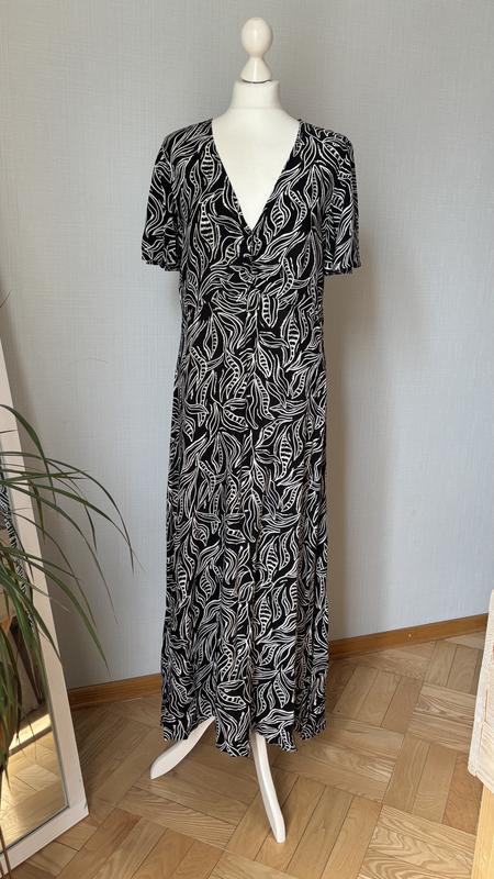 Сукня розмір М. Пише Л але сідає добре на груди 96-100, талія 74-76, стегна 104-108. Довжина на зріст 168 нижче середини голені але не в підлогу. Має сховану застібку на лівому боці. Стан ідеальний. Вдягнута рази три. 100% віскоза. На манекені виглядає як сукня бабці але насправді виглядає дуже романтично і жіночно.