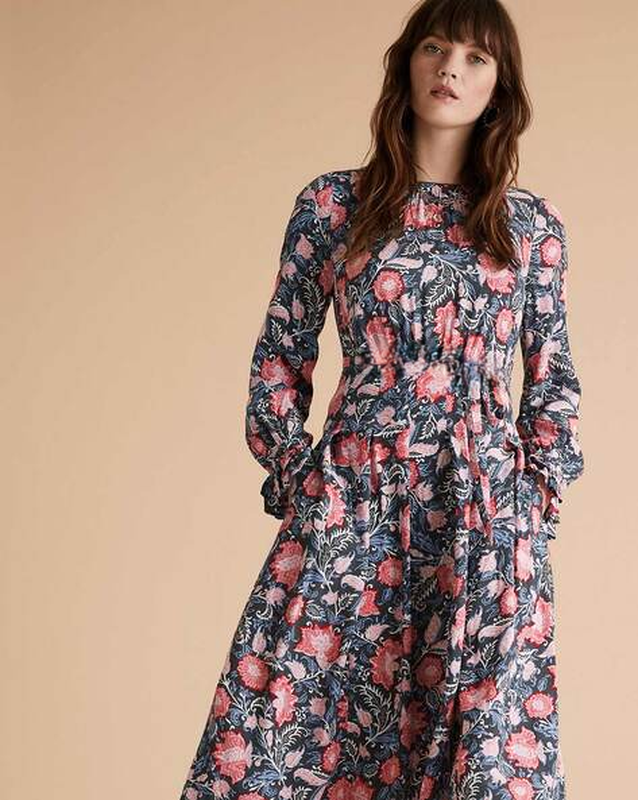Нежное платье миди цветочный принт закрытый верх, А-силуэта подол со складками от бедер, приталенное, некава с аккуратными оборками карманы! от M&S Per Una размер S XS длина 122 см ПОПлечи 35 см ПОГ 48 см ПОТ 37 см не тянеться ПОБ свободно, складки рукав 64см,ще + воланы 100% вискоза, прохладная комфортная ниспадающая зернистая ткань, средней плотности, карманы боковые ІДЕАЛЬНОГО СТАНУ,абсолютно