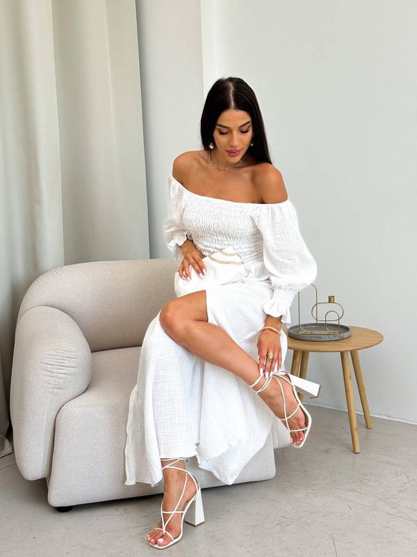 Ніжна бавовняна сукня 🕊 Модель 7030 ▫Тканина: льон-муслін , хлопок 100% ▫Розмірний ряд : 42-46, 48-52 ▫Кольори: беж та молоко 🏷 850 грн ФОТО РЕАЛ Ідеальна легка сукня на резиночці, з розрізом на нозі🥰 Ідеально підійде під будь-яке взуття , дуже легка та зручна 💌 Можна носити із закритим та розкритим плечем🌸 Під загорілі ніжки - саме те 🌞