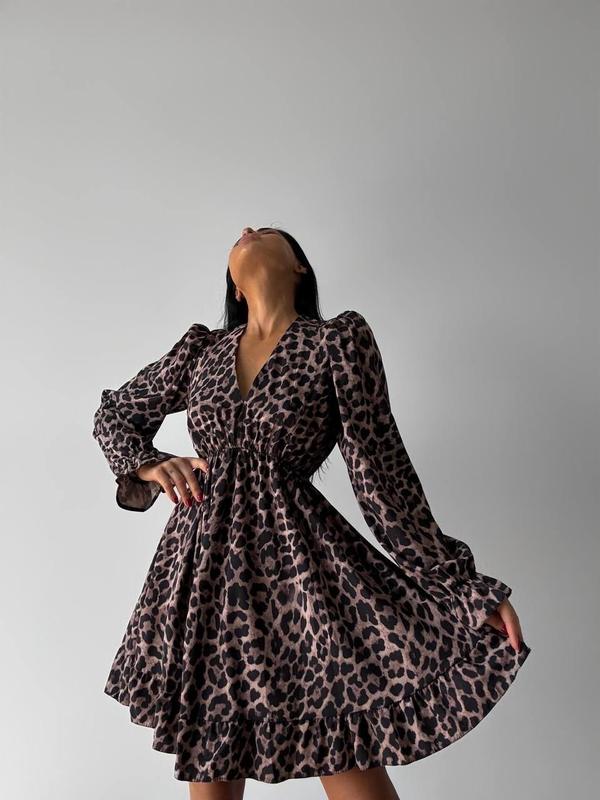 Фото реал Сукня #223 Тканина : софт лео Колір : леопард, чорний Розмір :єдиний (42-46) Вишукане леопардове плаття з воланами Одягай його і на романтичну зустріч, і на прогулянку з подругами Під грудьми йде на резинці , що дозволяє сукні ідеально лягти по фігурі