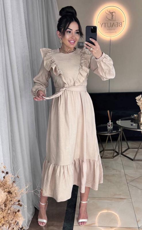 Бежева сукня міді з рюшами 💗 жіноча сукня міді 💗 красива жіноча сукня 💗