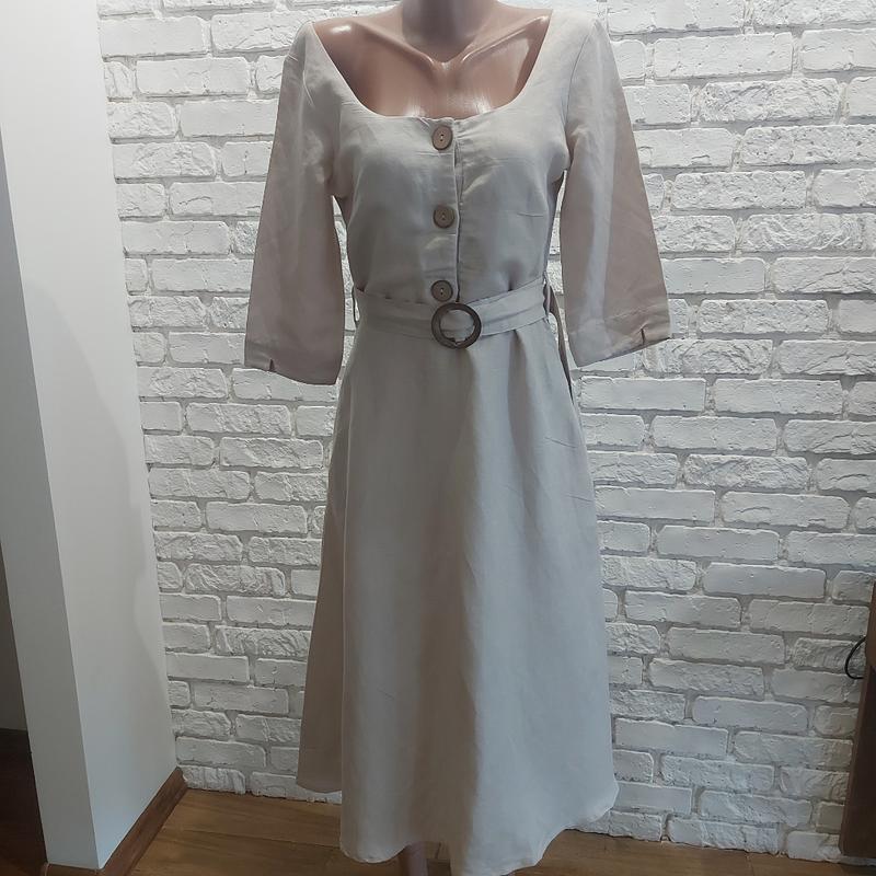 Сукня високої якості із натуральної тканини має приталений крій та вільну спідницю. З поясом.Дуже елегантна, фіксувався блискавкою на спинці. Має внутрішні бокові кищеньки для зручності . Легка. Колір ближче до натурального льону. Розмір S. Виробник Індія. Заміри: ПОГ 46, ПОТ 36 ПОБ 56 довжина 117 см.