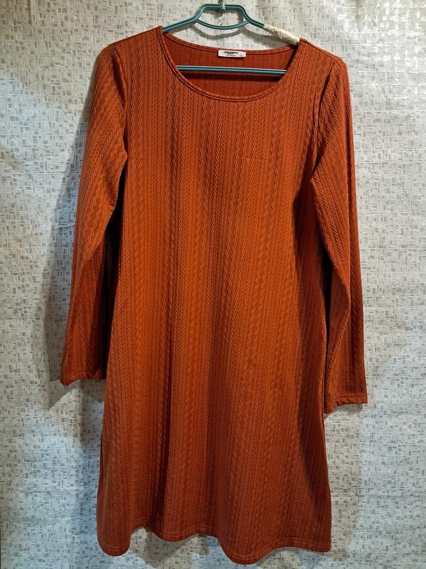 Сукня насиченого цегляного кольору. Стан дуже хороший(є пара затяжок,в носці непомітні) Довжина по спинці -98 см довжина рукава- 64 см ПОГ 52 см