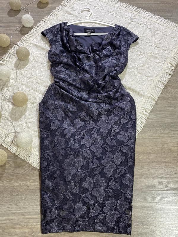 Ажурна серибриста актуальна сукня міді з драпировкою по талії.