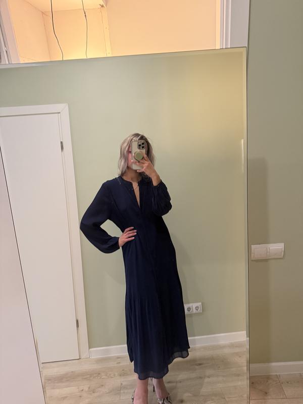 Темно синя, летюча , шифонова сукня mango. На пуговицах спереди( скрыты), имеет подкладку, есть элементы разного плиссе. Размер S. Стан очень хорош.