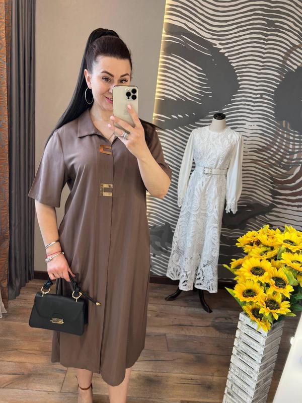 стильна сукня в стилі спорт шик це невід'ємна частина нашого сучасного гардеробу, легка сукня вільного силуету з акуратним вирізом на грудях, зручними кишенями, та рукавами 3/4 затишна та комфортна в побуті, у неї закохуєшся в першу хвилину, сукня виготовлена з приємного до тіла котону з еластаном, прикрашеного декором золотистого кольору розміри 50, 52, 54, 56, 58 залежно від розміру довжина 115-118 см, обʼєм грудей по виробу від 112 до 128 см, довжина рукава від шиї 55-58 см код LR 230834