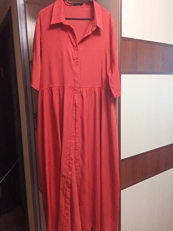 Колір більше помаранчевой, колір цегли, не червоний. 100% поліестра. Тканина тонка, легка, легко прасується ПОГ 63 ПОТ 63 ПОС до 95 ДОВЖИНА 140 РУКАВ 35 треба по краю прострочити