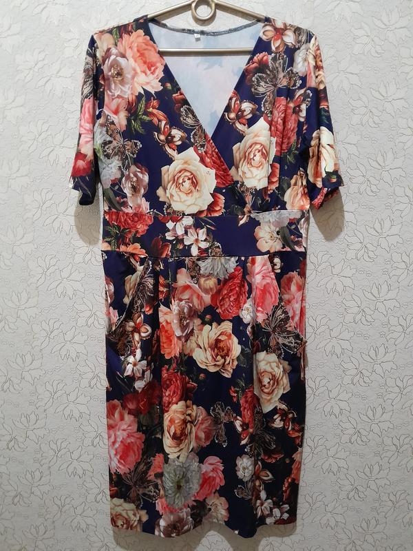 Платье Размеры в наличии 52,56, хорошо тянется, ткань масло. Параметры 52р: пог 48 талия 44, поб 53 длина 100. 56р: пог 54, талия 50, поб 63, длина 107 Платье на груди с запахом, есть два кармана, без бумажной этикетки, модель маломерная